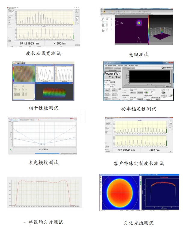 根据红光连续激光器的光学指标,划分单频(单纵模)、低噪声、窄线宽、长相 干、高稳定性、特殊定制波长、一字线及光纤耦合匀化光斑激光器等类型。以下为部 分出厂检测数据: